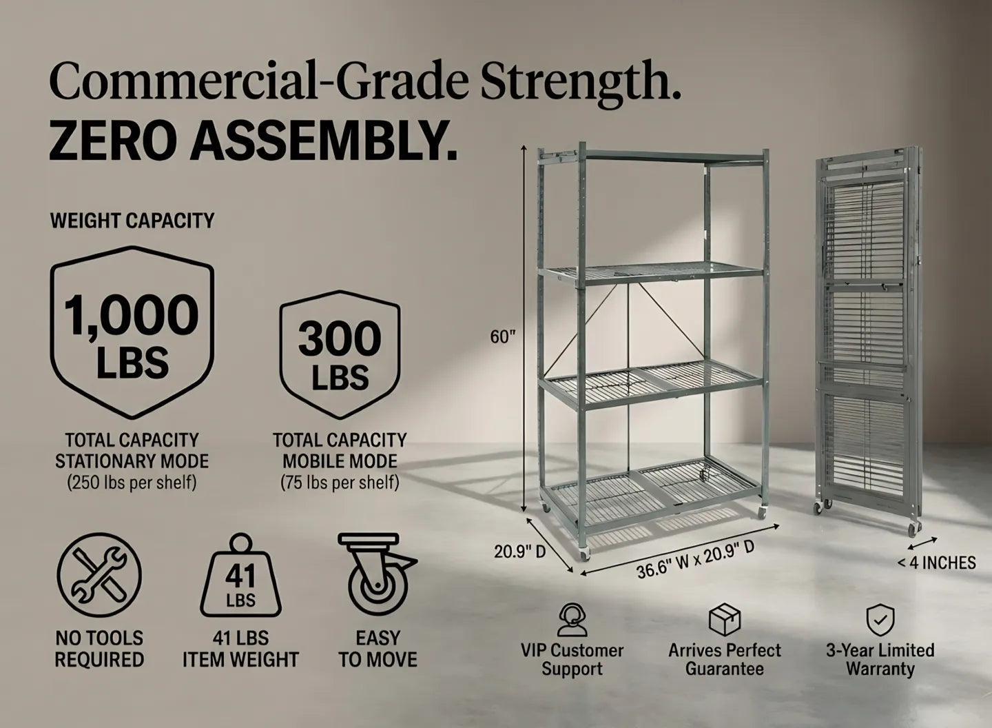 Pop open and start organizing in seconds. With 250 lbs per shelf, it's the perfect solution for your pantry, garage, or office.